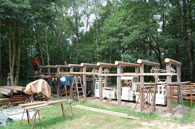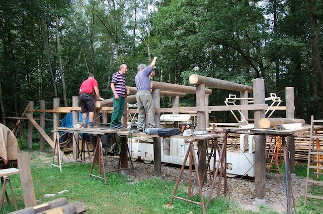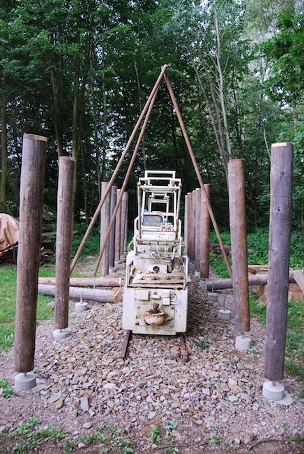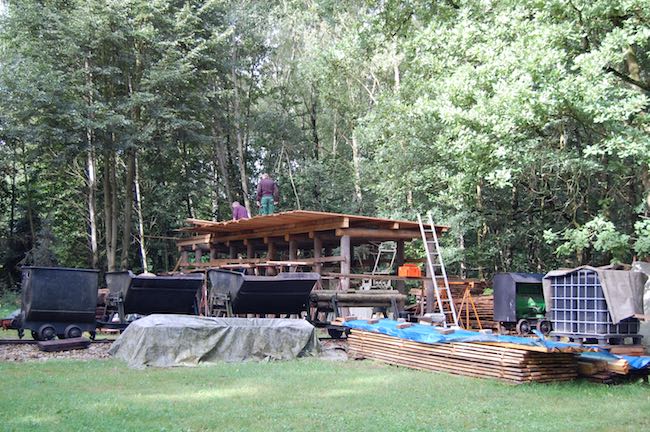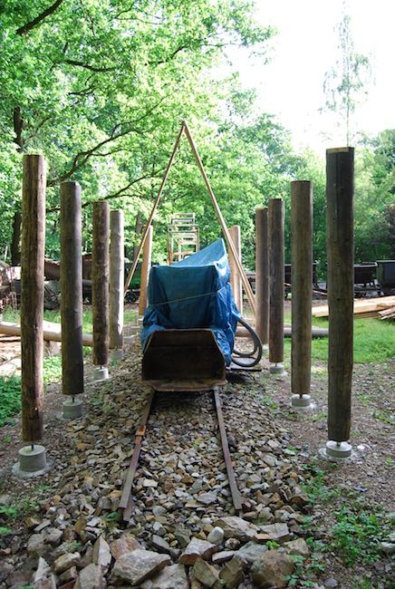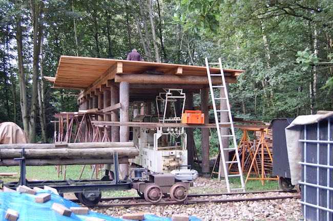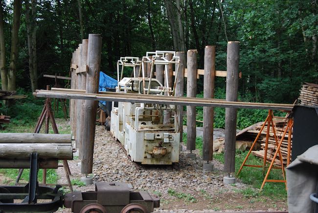 Nach der Montage der FA860 ging der Aufbau des Dioramas recht schnell vonstatten. Die Stempel für die Türstöcke wurden ausgerichtet und mit langen Schalbrettern fixiert, Rüstböcke aufgestellt zum aufsetzen der Kappen. Der Bauzustand im Sommer 2016: Die FA860 wurde regelrecht eingehaust. |