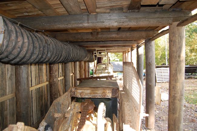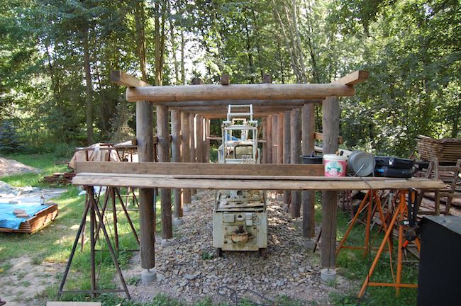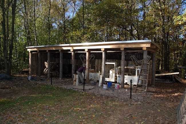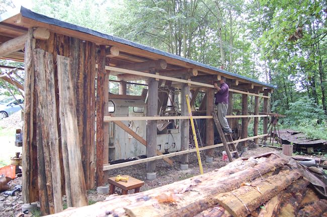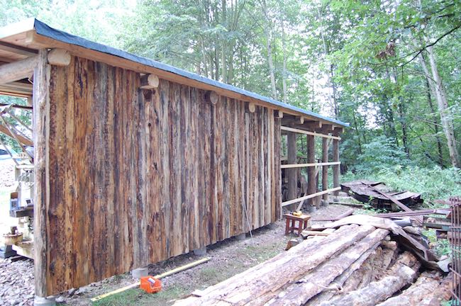 Unmittelbar nach der Dacheindeckung begann die einseitige Verkleidung des Dioramas mit Schwartenbrettern...