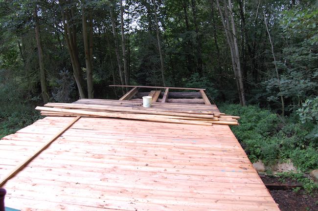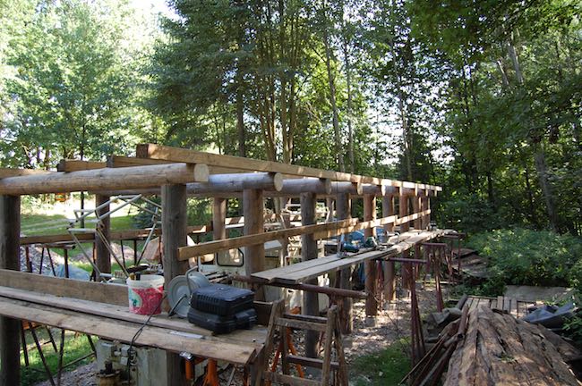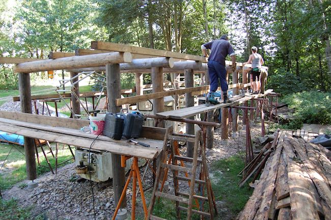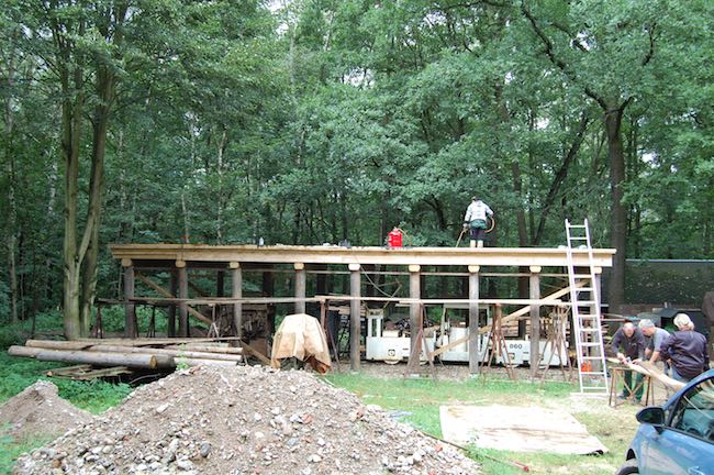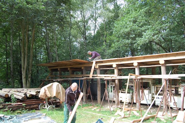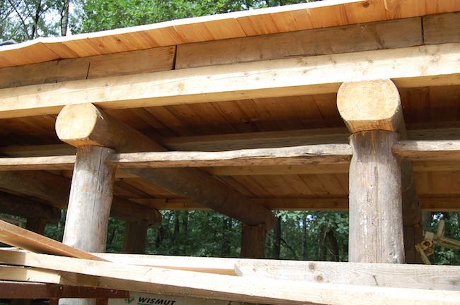 Gut zu sehen die Verlegung der Konstruktionshölzer für die Dachschräge zum Waldrand.