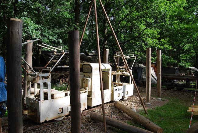 Die Grundidee war, eine Art Diorama zu bauen, um ursprünglich beide Loks dort vor den Wetterunbilden geschützt unterzubringen. Ein Diorama versteht sich als eine Art dreidimensionales Bild. Es sollte schon 2015 im Rahmen einer Fördermaßnahme errichtet werden, jedoch wurden dafür von Seiten des Maßnahmeträgers sinnfreie Forderungen gestellt, die für den Bergbauverein unerfüllbar waren. Der Verein entschloß sich daher, das Diorama selber zu errichten ! Als Diorama versteht man eine Art dreidimensionales Bild ähnlich einem Weihnachtsberg oder der heute allseits beliebten Modelleisenbahn. Jedoch sollte dieses Diorama nicht maßstäblich verkleinert, sondern in originaler Größe angelegt werden. Dabei wurde die Idee eines mit Holz nach WISMUT-Norm hergestellten Stollns, welcher nur einseitig verschalt werden sollte, bevorzugt. Es sollte eine mit Türstöcken ausgebaute Hauptstrecke mit Wetterlutte und allem, was noch so dazu gehört, und mit dem Mittelpunkt der beiden Loks gebaut werden. Für das Diorama war ein Platz mit gut 10 m Länge vorhanden. Bis Ende des Jahres 2016 war die Gleisanlage
