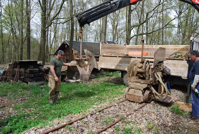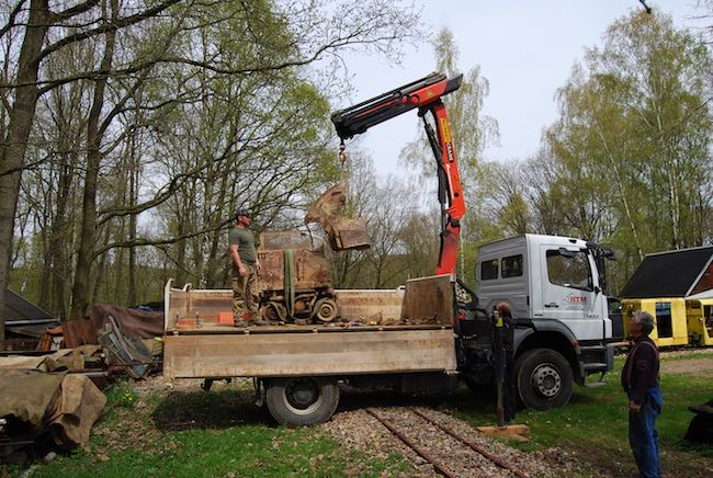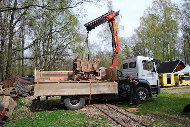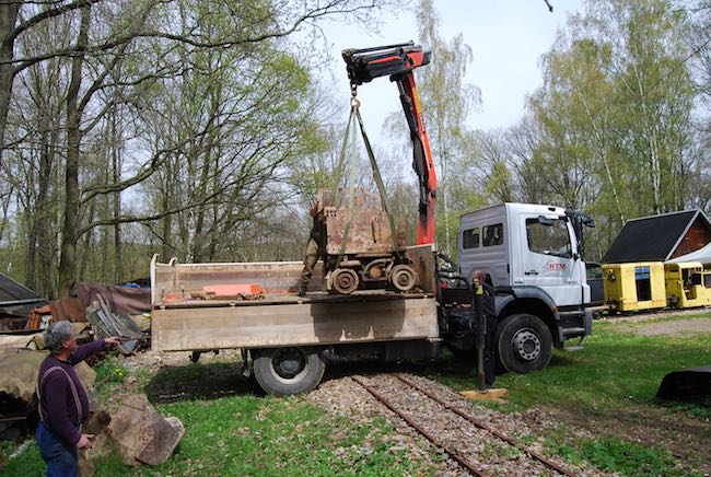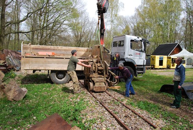 Mitten im Bau der Gleisanlage für das Diorama im Jahr 2016 erwarb der Bergbauverein noch einen voll funktionstüchtigen Wurfschaufellader, welcher ebenso dort untergebracht werden sollte... Der im Kalkwerk Hermsdorf mittels Großtechnik aufgeladene Wurfschaufellader erwies sich allzu schwer für den Ladekran des LKW.