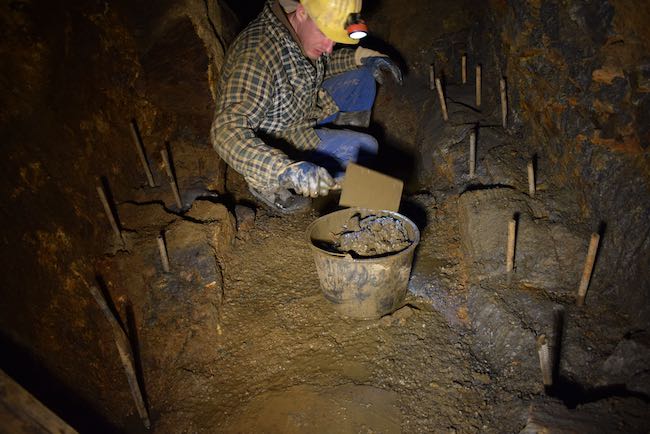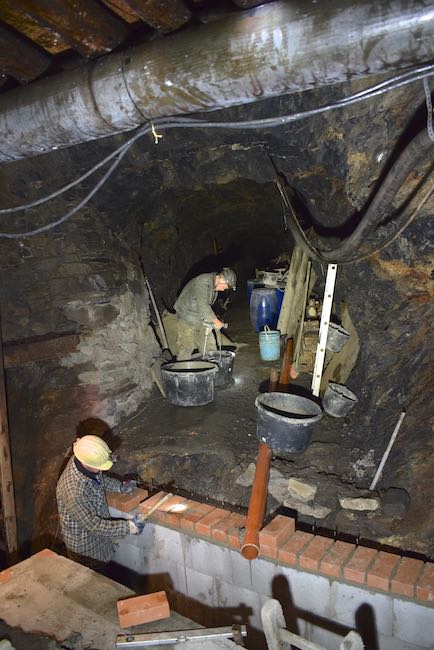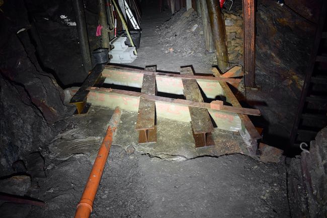 Einen weiteren Ausschlag in diese Richtung war der Erhalt einer fast kompletten Lokbatterie die noch „trocken“, also noch nie für den Einsatz vorbereitet war, jedoch schon sehr alt weil aus der DDR-Zeit. Die Batterie weckte die Hoffnung für eine Inbetriebnahme einer Lok. Solch ein Fund und noch einiges mehr ließen die Idee vom Einbau einer Grubenbahnanlage gedeihen! Da es im Verein auch Bedenkenträger gibt, wurde das Projekt „Einbau Gleisanlage“ für den händischen Transport der Ausrüstung für die Mettenschichten und andere Veranstaltungen oder auch Arbeiten deklariert. Doch gab es ein großes Nadelöhr wo man mit einer gut 3 Tonnen schweren Akkulok nicht drüber fahren konnte – die Brücke im Streckenkreuz mit dem Hülfe des Herrn Stolln. Da ja wieder einmal Corona-Krise war und die Vereine alle Veranstaltungen absagen und nichts dergleichen unternehmen durften, war für solch einen „Brückenschlag“ die richtige Zeit angebrochen. Wieder war es eine für die Sicherheit wichtige Arbeit die ein Treffen im Verein vor Ort mit einer kleineren Mannschaft als sonst üblich bei uns möglich wurde. Wichtige bergtechnische arbeiten waren ja aus den Verboten heraus genommen. Welch ein Glück für uns. Um überhaupt eine neue Brücke planen zu können, mußte die