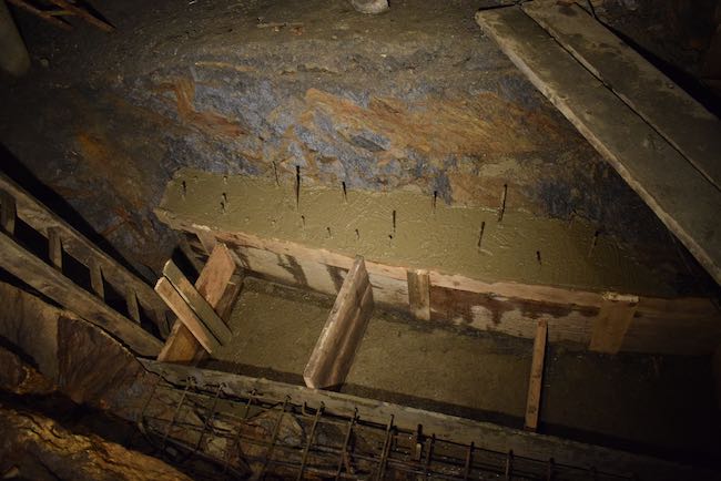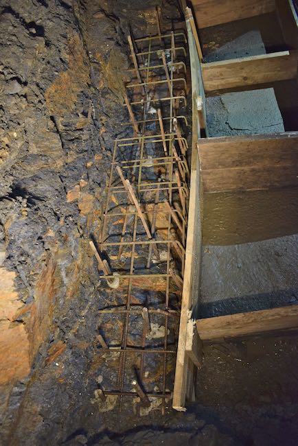 Nach dem Freilegen und Herrichtung der Fundamentsohlen sind Verbindungsanker für die Armierung des Brückenfundamentes eingebaut worden.